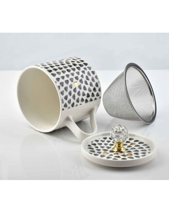 Porcelánový hrnček s oceľovým čajítkom s vekom a diamantovou rukoväťou zo série NIOCOLE DIAMOND od Affek Design. Moderný tvar a jemný šedo-zlatý vzor je ako stvorené pre najnáročnejší interiér. Perfektné na darček.