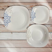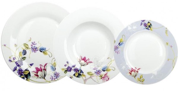 Sada tanierov Florina LUNA 18 ks. - vkusná jedálenská súprava. Tanierová súprava je vyrobená z kvalitného porcelánu. Každý tanier je zdobený elegantným kvetinovým vzorom. Sada je zabalená v peknom balení, takže môže byť skvelým nápadom na darček. Súprava obsahuje 6x dezertný tanier, 6x tanier na polievku, 6x veľký, plytký tanier. Porcelán nezasahuje do chuti a vône jedla, je ekologický, antialergický.